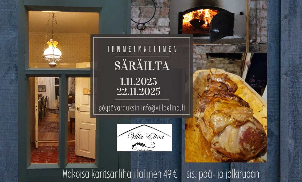 Villa Elina muuttuu tunnelmalliseksi Säräpirtiksi 1 lokakuun, 2025 Ravintola aukeaa klo 18.00, Pöytäväraukset info@villaelina.fi tai 045 1339400 Pitkään kypsytetty murea ja mehukas karitsanpaisti tarjoillaan buffetista muiden lisukkeiden kera. Jälkiruoaksi kakku ja kahvit.